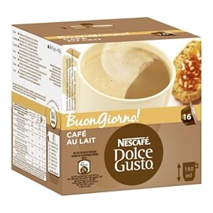 NESCAFE DOLCE GUSTO Cafe au Lait aromatisch und milchig. Die Sorte Cafe au Lait bringt ein neues Lebensgefühl nach Hause. Ideal zum Frühstück und für den großen Becher. 16 Portionen für den perfekten Genuss.